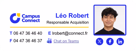 Avec Letsignit, vous pouvez ajouter facilement des pictogrammes réseaux sociaux dans les signatures mail de vos collaborateurs et renvoyer vers vos profils “entreprise”. Aussi, notre fonctionnalité "attributs" vous permet de gérer des URL personnalisées pour chacun de vos collaborateurs afin de rediriger vers leur compte LinkedIn par exemple.
